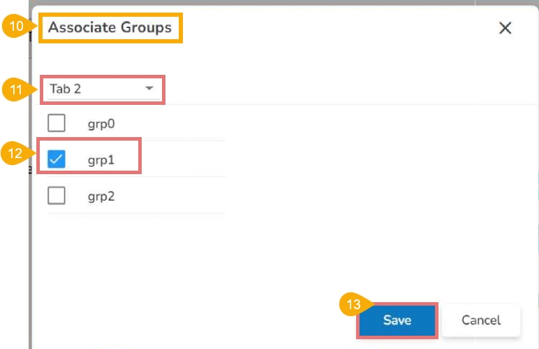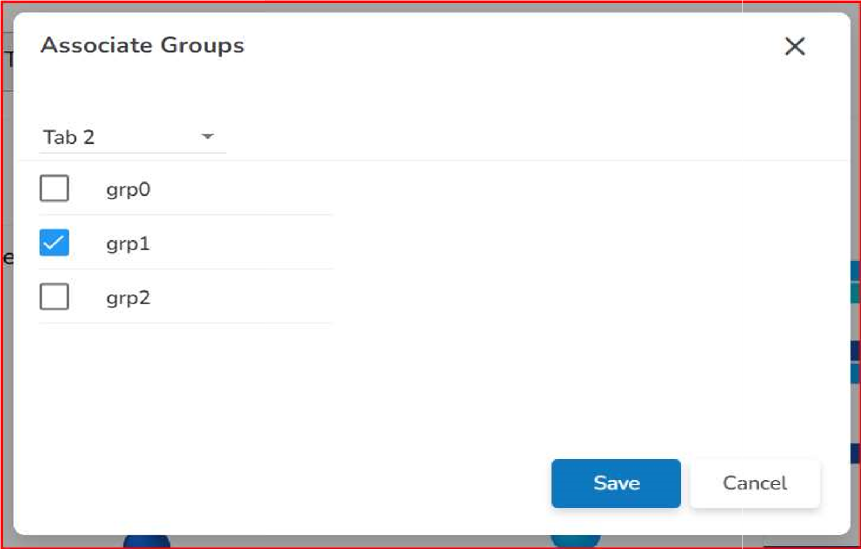 The Associate Groups option is used to associate groups with charting components to each tab using the drop down as shown in the below given image: