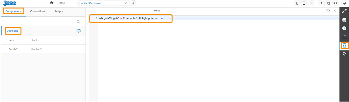 Navigate to dashboard script area, and write the script to enable drill highlighter (the script used has been provided in the code block).