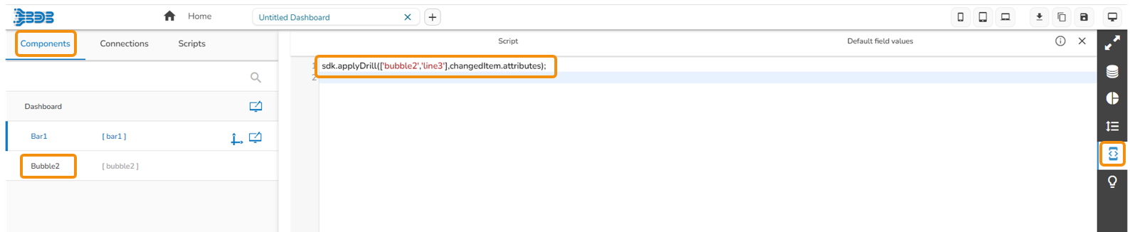 Go to source component script area .ex, Go to bar chart script area & write a script to enable drill (the script used has been provided in the code block).