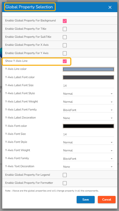 Ensure consistency and visual coherence across all the charts in the dashboard by utilizing Global Properties for the Y-axis. It helps to standardize all the dashboard components containing Y-Axis in terms of Label appearance, readability, and text decoration.