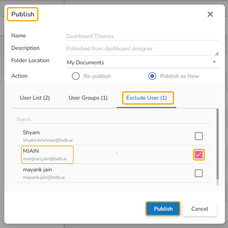 Click the Publish option even to Exclude a user from the rights to access a dashboard.