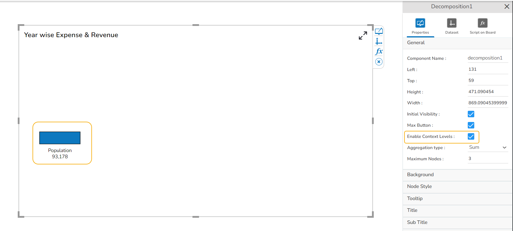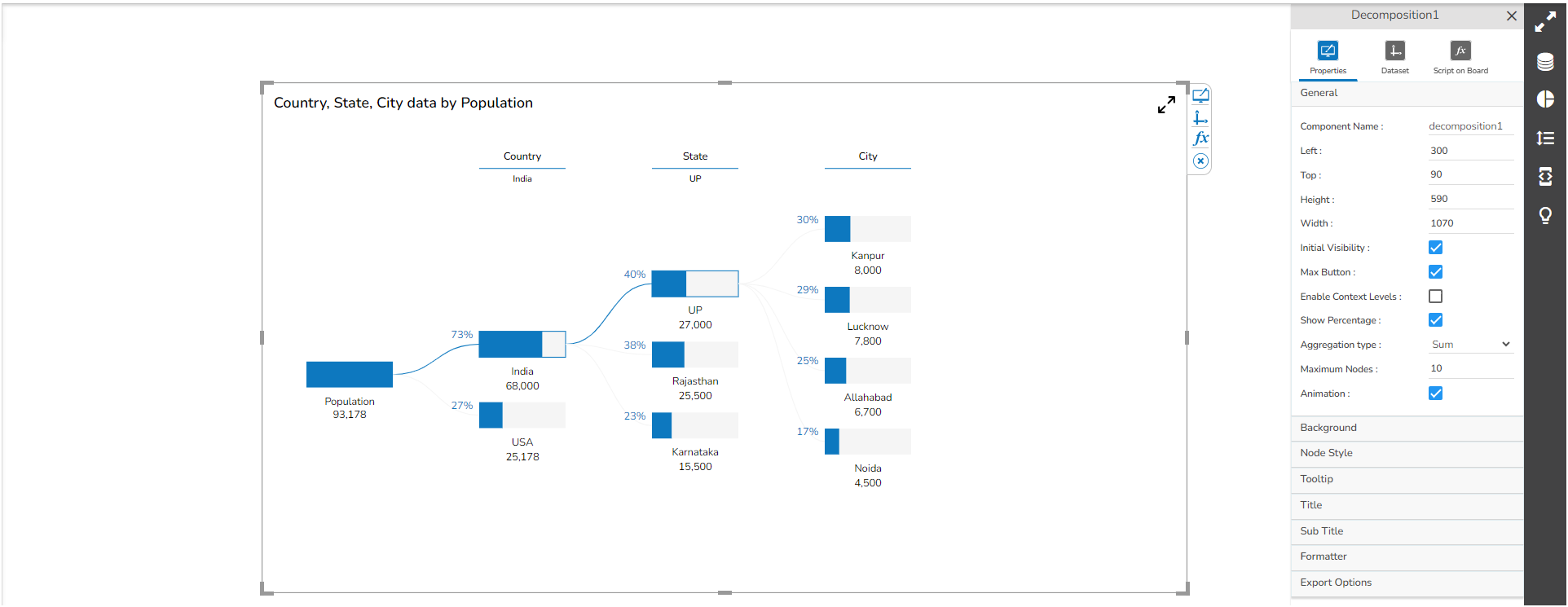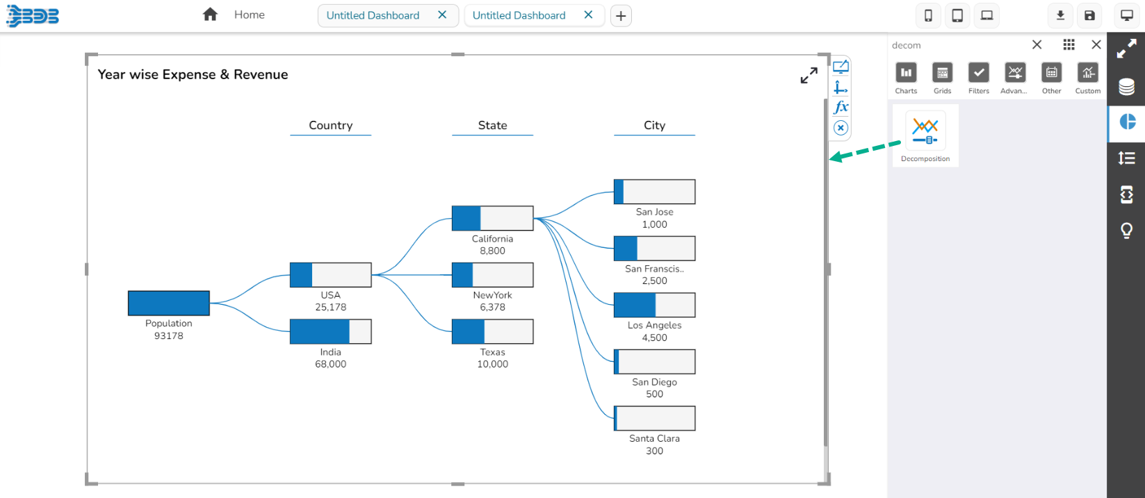 Drag and drop the decomposition chart from the component library. The chart looks as given in the below image on the Designer canvas page: