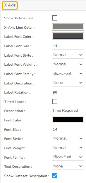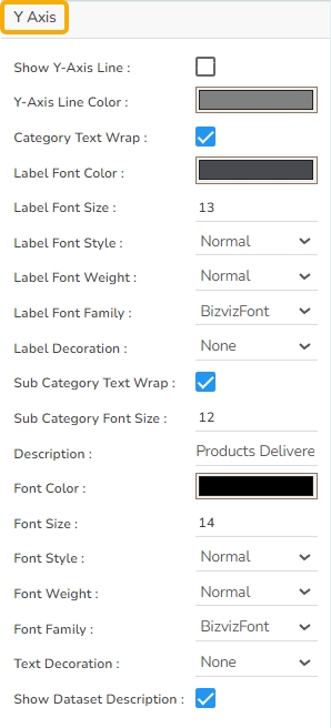 The user can change the axis name, Font color, Font size, Enable the axis line, and the axis color. The user also gets an option to wrap text for the Category and Sub Category.