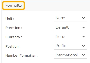 The user can change Y-axis values in units to %, T, Lacs, M, etc. Precision if we want the value in decimal format. Currency if we want the value in INR, Pound, USD. Position of the currency if it's in prefix and currency in Rupee then the sign will be seen in left-side if it's in suffix then it will be seen in right-side. Number Formatter if we want it in Indian or international.