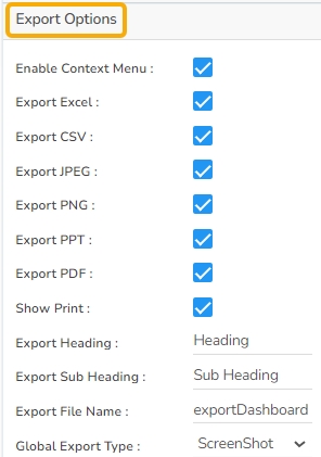 The Export Options also helps to provide heading, subheading, file name. The user can also select an option for Global Export Type.