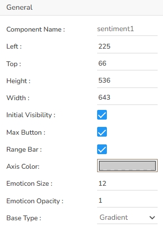 The user can change the height, width, top, left, can enable the range bar, change the axis color, can change Emoticon size & color and base type to plain and gradient.