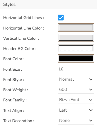 Styles: The user can enable the horizontal line and change the color for horizontal & vertical lines, can change the font size, font color, text style, etc.