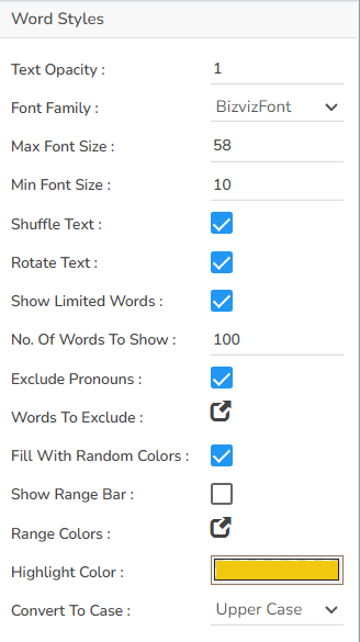 The user can enable the shuffle text, rotate text, show limited words, can change the highlighter color, can change the words to upper case, lower case.