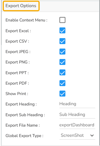 The Export Options also helps to provide heading, sub heading, file name. The user can also select an option for Global Export Type.