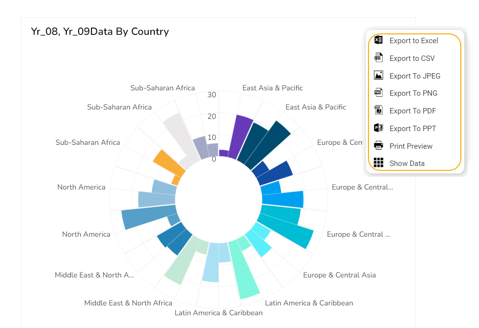 The Circumplex chart, also known as the Polar Area chart or Nightingale Rose chart, is a combination of the Bar chart and Pie chart. The Circumplex chart can be drawn on a polar coordinate grid. Each category or interval in data is divided into equal segments on the radial chart. The distance of each segment from the center, as per the denoted values, depends on a polar axis. Therefore, each ring from the center of the polar grid can be used as a scale to plot the segment size and represent a higher value.Each category may have more than one sub-category, where each sub-category is shown by a section of the disc and each section has the same angle. The value of the corresponding sub-category is shown through the area. By changing the radius in a Circumplex chart, the user can adjust the area of each segment (based on data).