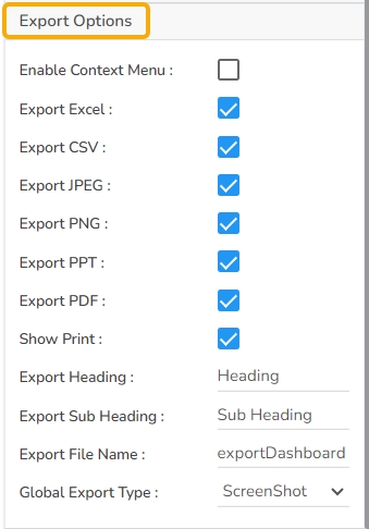 The Export Options also helps to provide heading, subheading, file name. The user can also select an option for Global Export Type.