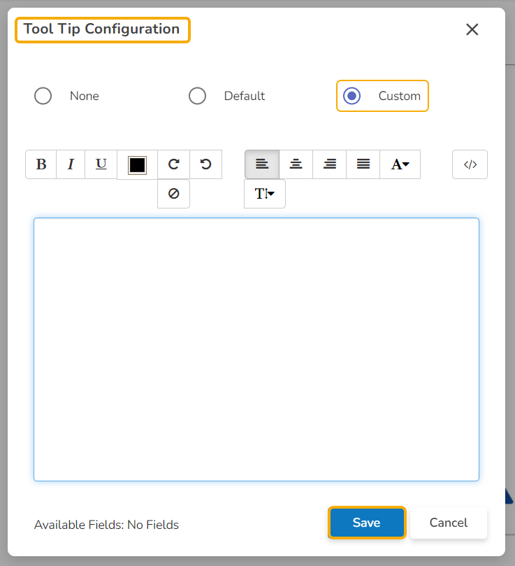 Please Note: The Custom option for Tool Tip Configuration opens with the following framework to configure a Tooltip.