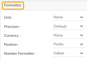 The user can change units to % or none. Precision if we want the value in decimal format. Currency if we want the value in INR, Pound, USD. Position of the currency if it's in prefix and currency in Rupee then the sign will be seen in left-side if it's in suffix then it will be seen in right-side. Number Formatter if we want it in Indian or international.