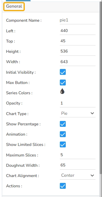 The user can change the height, width, top, left. If initial visibility is unchecked, then the chart won’t be visible at the first preview. If the max button is unchecked, then we can’t maximize the chart separately. We can change the color we want to see in the pie in the series color section and change its transparency in the opacity section. Chart type can be Pie, Doughnut, or Semi Doughnut. Can change the number of slices by clicking on the ‘show limited slices’ and by providing its number in ‘Maximum Slices’. Doughnut width can be increased or decreased also change the Chart Alignment. If the ‘Actions’ option is enabled then the user ‘show data’, ‘sort data’, ‘export’ the chart to PNG, PPT, PDF, or excel.