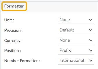 The user can change Y-axis values in units to %, T, Lacs, M, etc. Precision if we want the value in decimal format. Currency if we want the value in INR, Pound, USD. Position of the currency if it's in prefix and currency in Rupee then the sign will be seen in left-side if it's in suffix then it will be seen in right-side. Number Formatter if we want it in Indian or international.