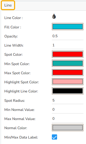 After changing the type of chart to the line in the general section user can make modifications in this section in order to make the Sparkline chart more meaningful. Line color and width can be changed. The user can fill the area between the line and x-axis, change its opacity. It is also possible to change the spot color, Minimum-Maximum-Highlight Spot color. Also, the user can change the Highlight Line color. If the user provides values to the minimum and maximum normal values and normal color, the user can see an area marked in the chart that lies between those values. By enabling the Min/Max Data label the user can see the Minimum and Maximum value directly in the chart.