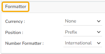 The user can change units to % or none. The user can set the Precision option to see value in decimal format. The user can display currency value in INR, Pound, USD. The position of the currency symbol can be set as Prefix (if the currency is in INR format) otherwise, it can appear on the right-side as Suffix. Number Formatter can set it in Indian or International.