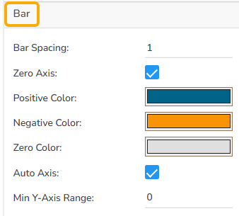 After changing the chart type to bar in the General properties section, the user can make changes in this section in order to make the bar chart look more meaningful. The user can change the bar spacing, enable the zero-axis, change the colors for positive bar, negative bar, and zero bar. Also, can enable the Auto axis and provide a Min Y-axis range.