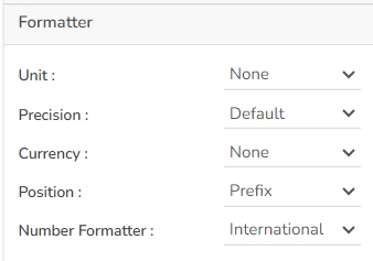 The user can change units to % or none. The user can set the Precision option to see value in decimal format. The user can display currency value in INR, Pound, USD. The position of the currency symbol can be set as Prefix (if the currency is in INR format) otherwise, it can appear on the right-side as Suffix. Number Formatter can set it in Indian or International.
