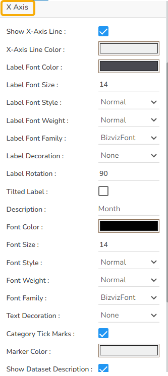 The user can show the x-axis line, change the x-axis line color, label color, font size, font weight, font family, description, etc. The user can rotate the label using the X-Axis.