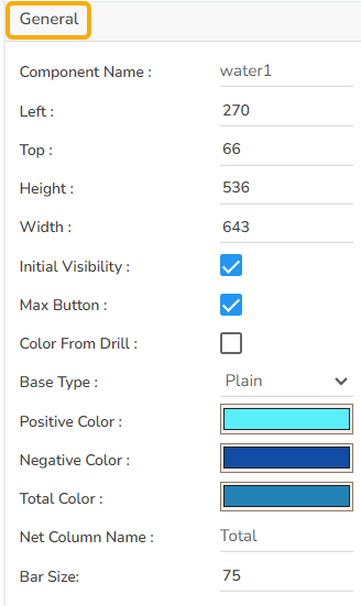 The user can change the height, width, top, and left values. If initial visibility is not enabled, then the chart will not be available for the first preview. If the Max Button is enabled, then the user can maximize the chart. The user can change the base type between Plain, Gradient 1, Gradient 2, and Gradient 3. The user can set colors for positive, negative, and Total Values. It is also possible to adjust the bar size.