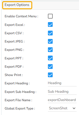 The Export Options also helps to provide heading, subheading, file name. The user can also select an option for Global Export Type.