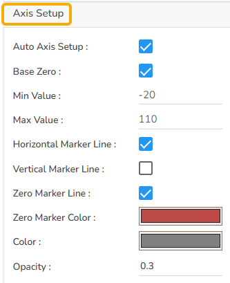 The user can either set up the base as zero or else set up another minimum value. The user can include horizontal Marker lines as well as Vertical marker lines and change their color.