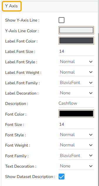 The user can show the y-axis line, change the y-axis line color, label color, font size, font weight, font family, description, etc.