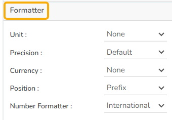 The user can change units to % or none. The user can set the Precision option to see value in decimal format. The user can display currency value in INR, Pound, USD. The position of the currency symbol can be set as Prefix (if the currency is in INR format) otherwise, it can appear on the right-side as Suffix. Number Formatter can set it in Indian or International.