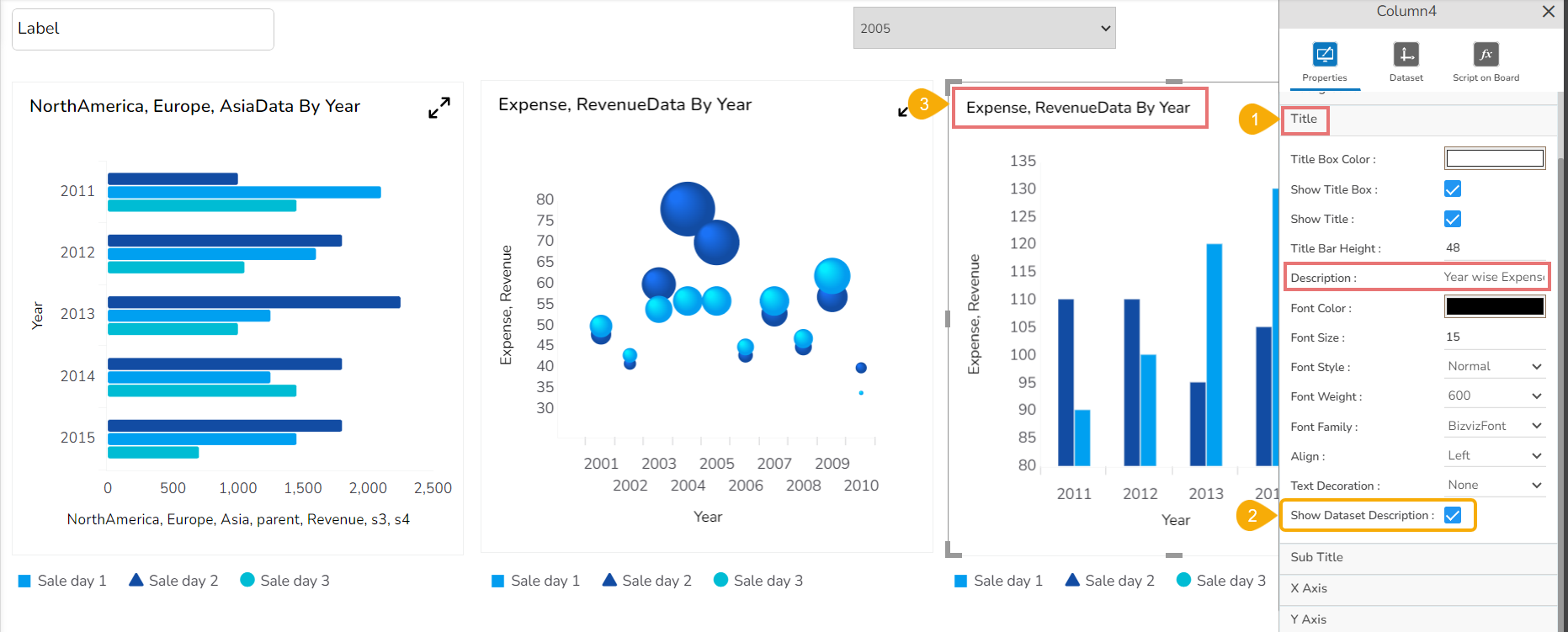 • It will reflect the Title description based on the selected category and series fields for that charting component ignoring the inserted Title description for that chart.
