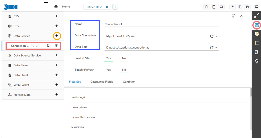 * Click the **Create New Connection** icon provided next to the **Data Service** connector.