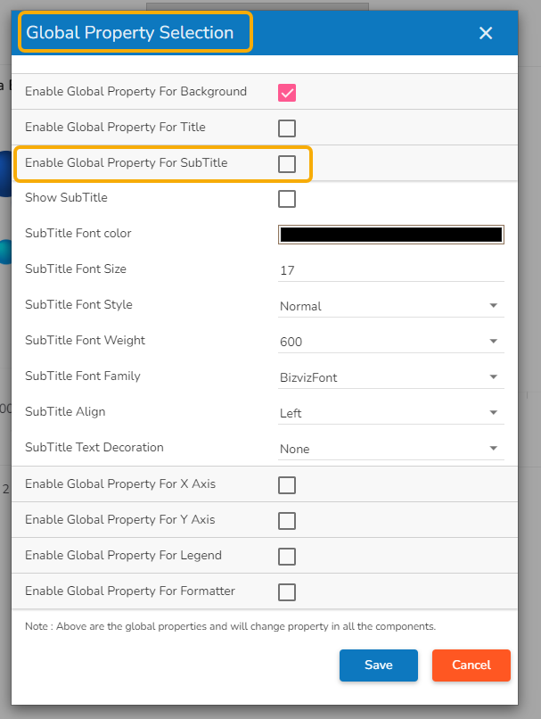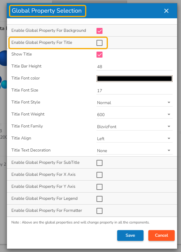 The user must click the Save option after setting or modifying the desired set of Global Properties to apply them on the selected dashboard.