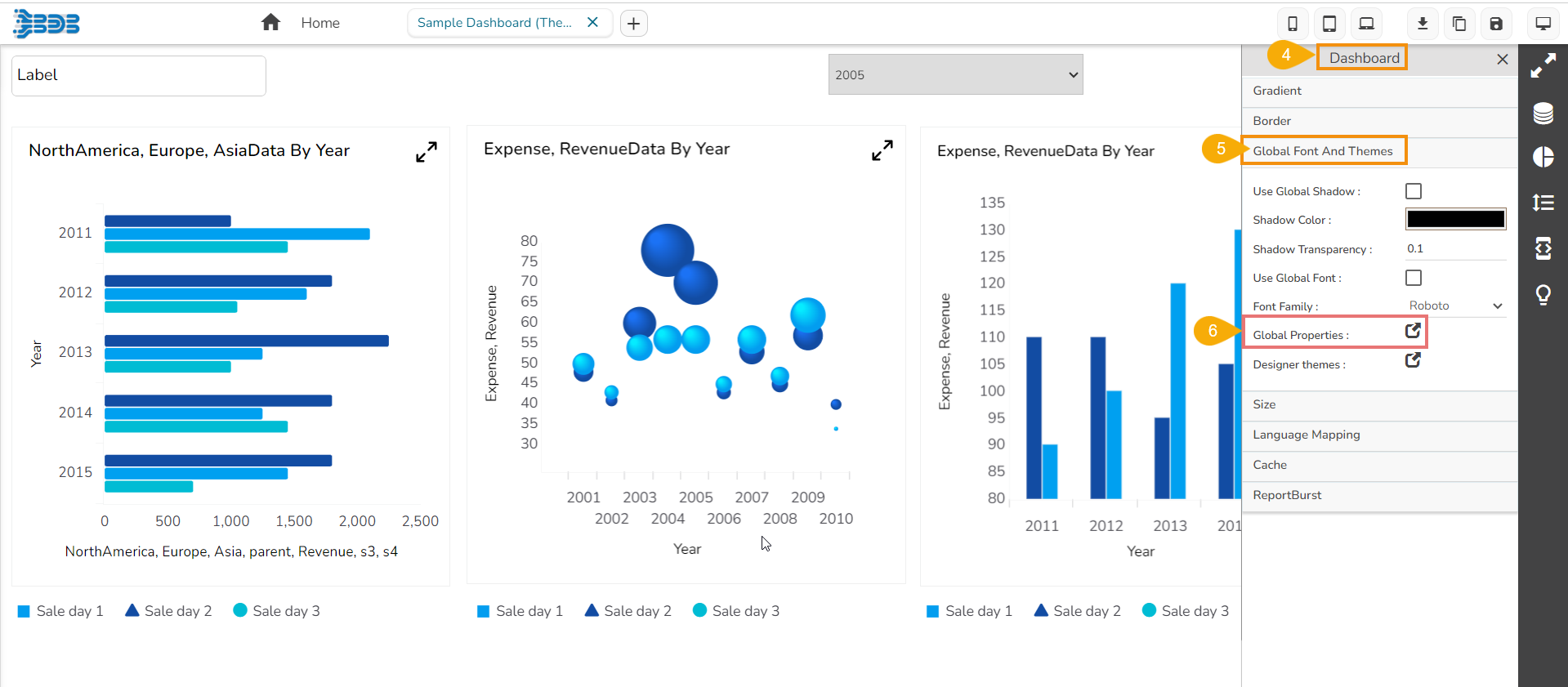 The Global Properties feature streamlines the design process and saves time by providing a single point to manage appearance settings for the entire dashboard.