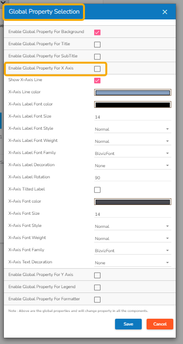 By utilizing Global Properties for the X-axis, users can ensure consistency and visual coherence across all charts and graphs in the dashboard that use the X-axis. It helps to bring in uniformity for all the dashboard components containing X-Axis in terms of Label appearance and readability.