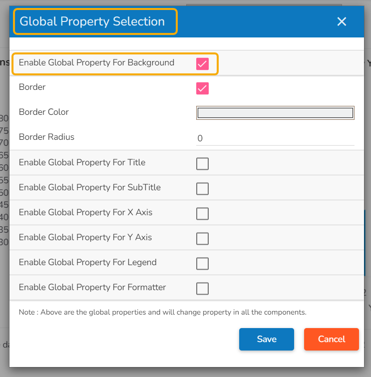 Apply a border for all the dashboard components and set color and radius of the border for all components enabling the Global Property for Background.