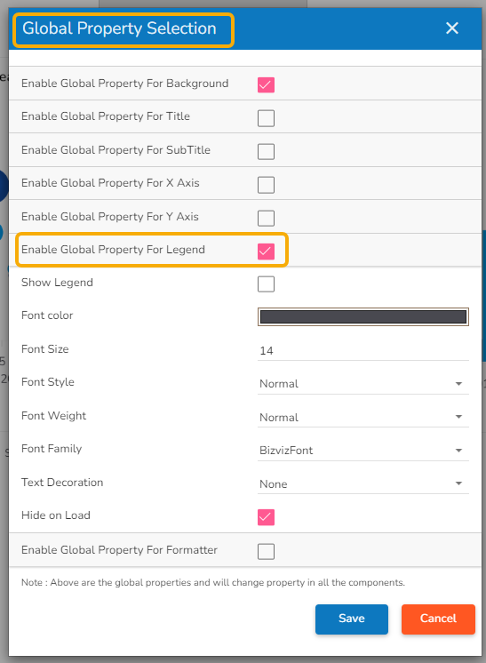 The Global Properties for Legend allows the user to customize the appearance properties of the legend to align with your design preferences.