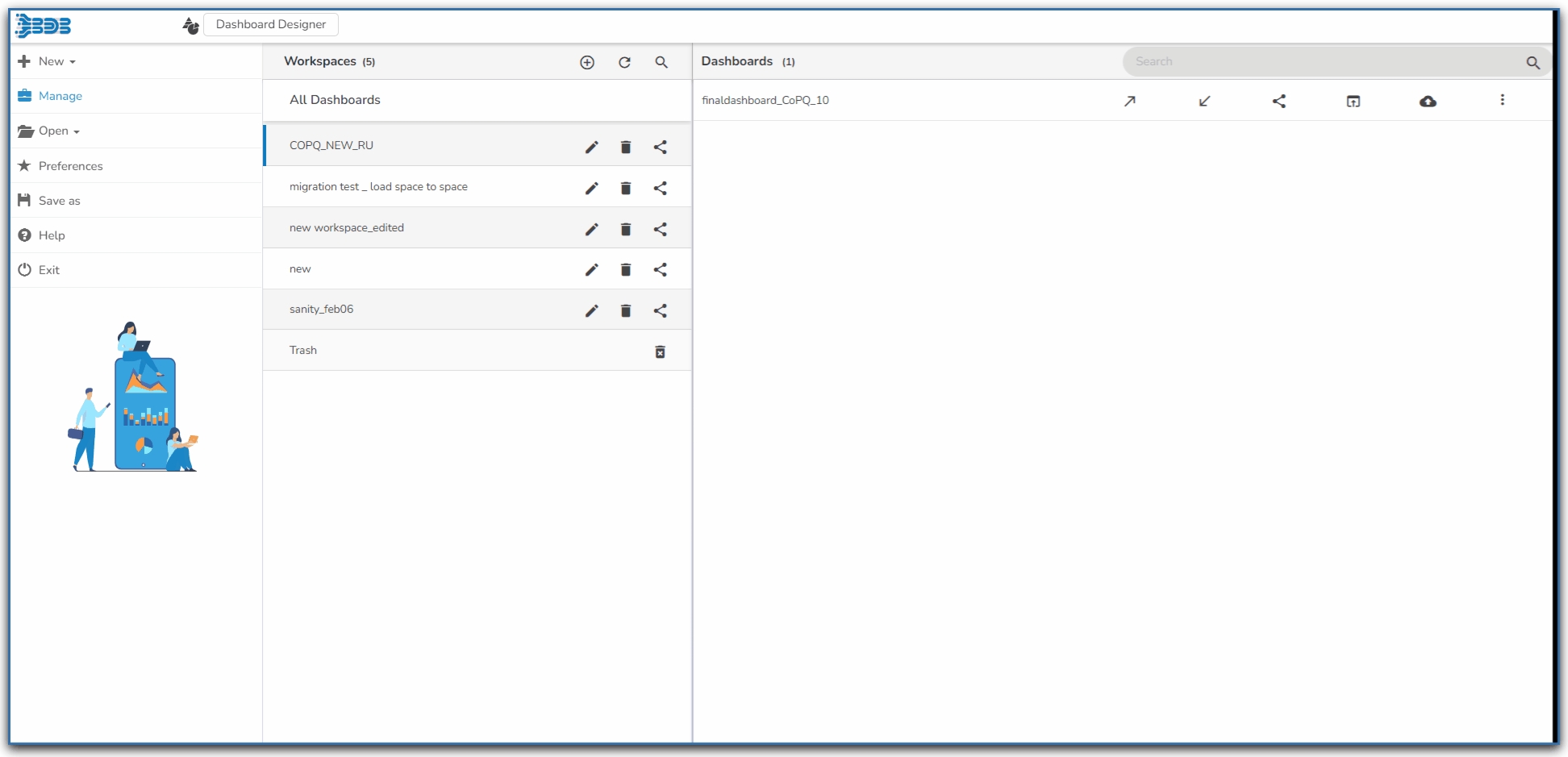 Navigate to the saved Dashboards list using the Manage option.