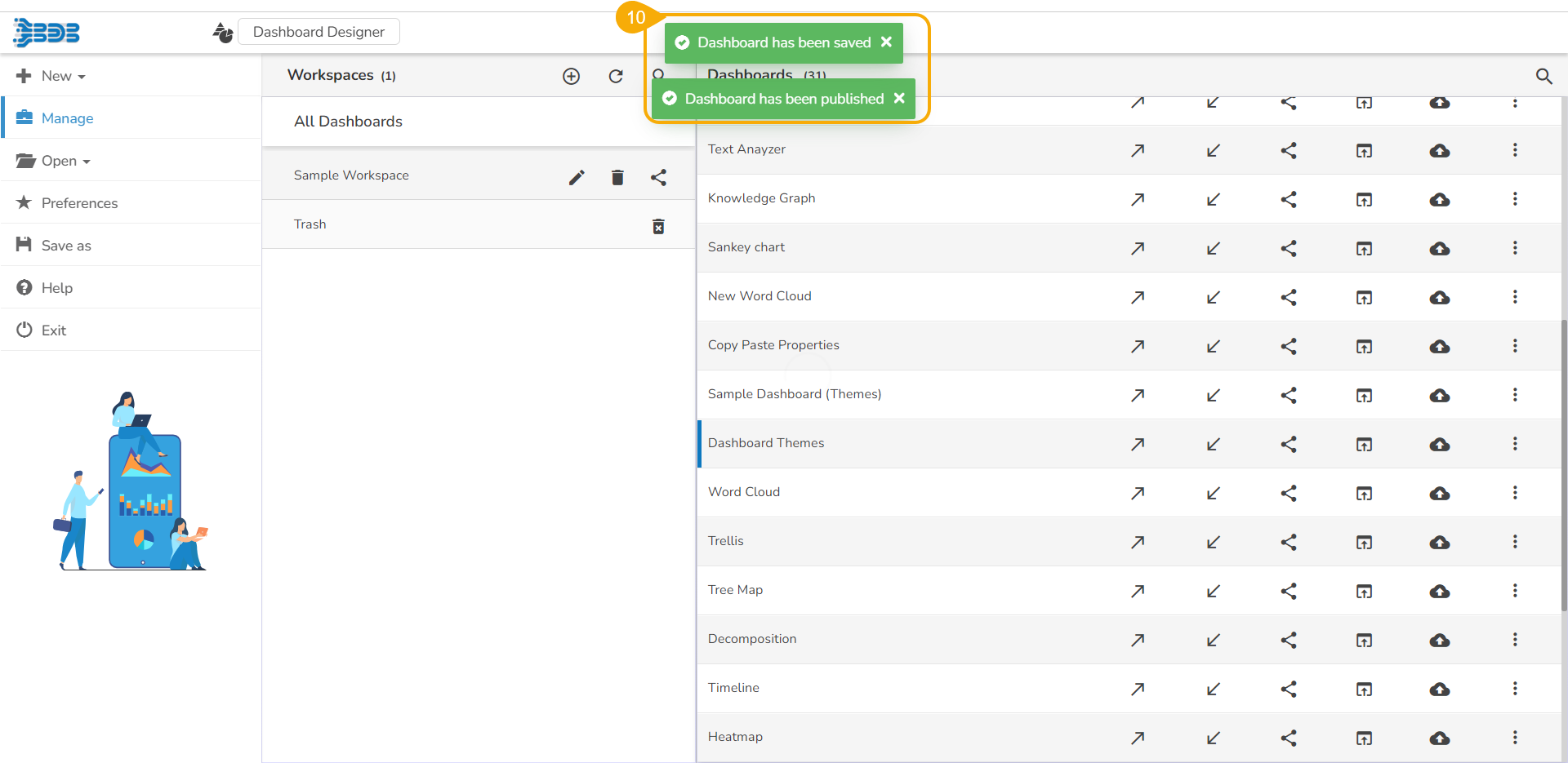 Select a Dashboard from the list of the saved dashboards under the selected workspace.