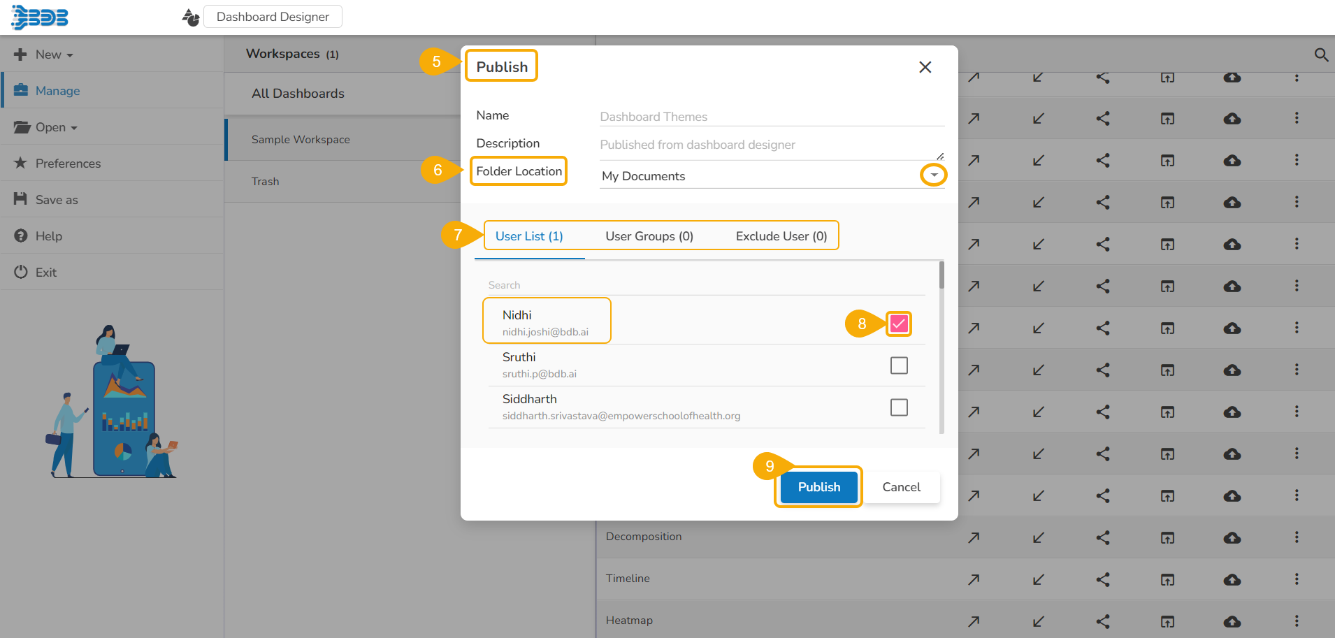 Click the Publish option even to Exclude a user from the rights to access a dashboard.