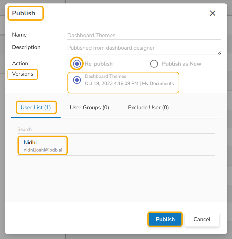 Click the Publish option to complete the action of republishing a dashboard or Publishing a Dashboard as New.