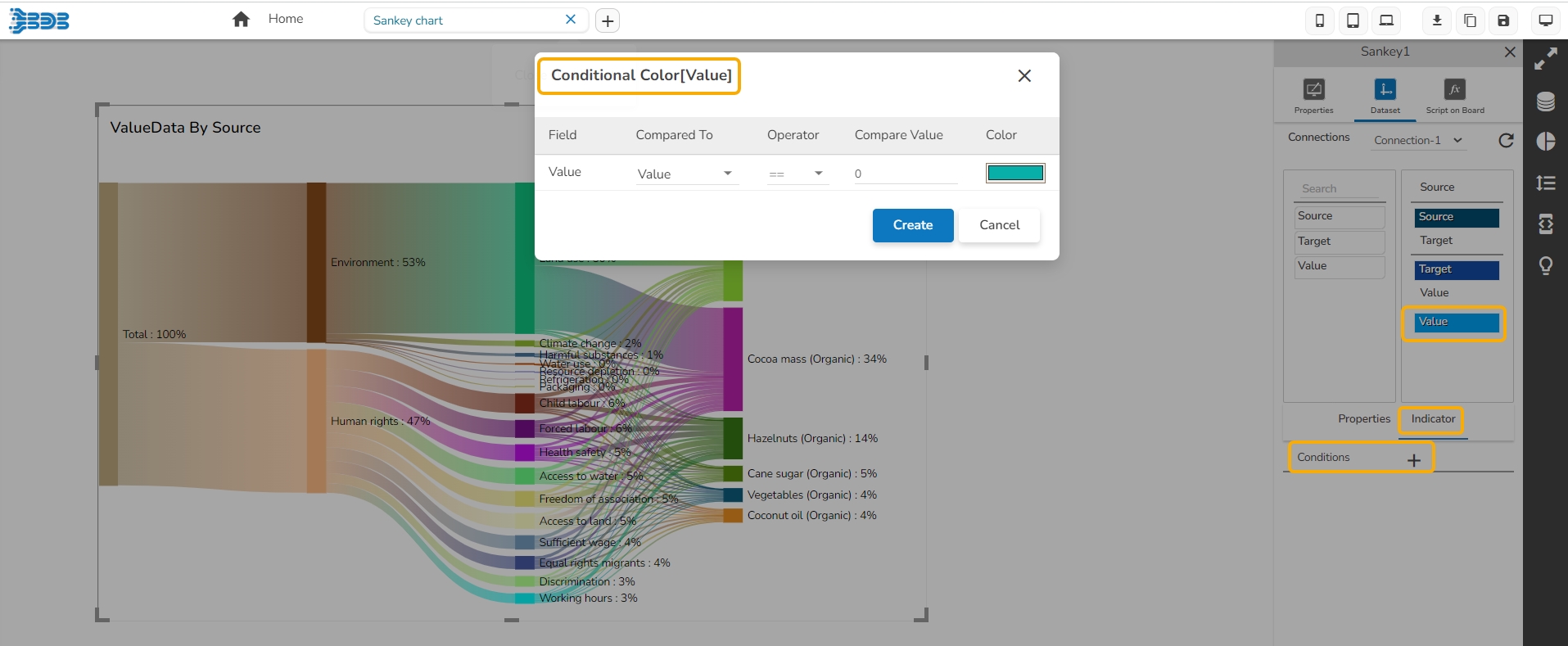 The user can provide color based on the Categories of the Source field and Sub-Categories of the Target field using the Indicators tab. Based on the inserted names the colors get reflected in the preview mode.