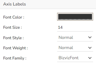 The Axis Labels properties allow customization to enhance chart readability and presentation. Users can adjust various font attributes:
