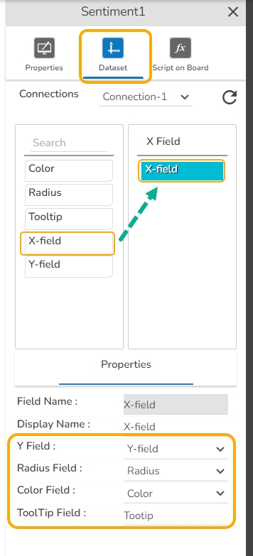 Drag the X-field as X Field and map the other fields under the Dataset Properties (as explained above).