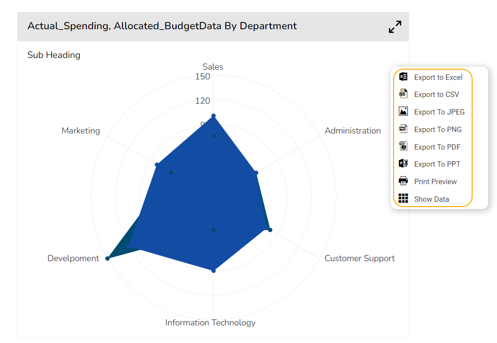 Actions: Custom actions that can be associated with the chart such as sorting, exporting, and displaying data in the tabular format will be listed in the preview mode of the chart.