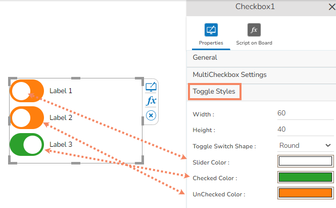 The user can also define colors for the Toggle Slider, Checked Color, and UnChecked Color.