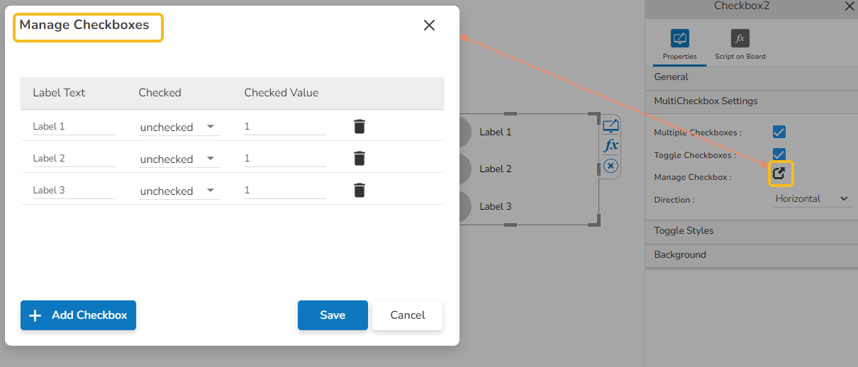 Manage Checkbox: Click the Manage Checkbox icon to access the dialog window for managing multiple checkboxes.