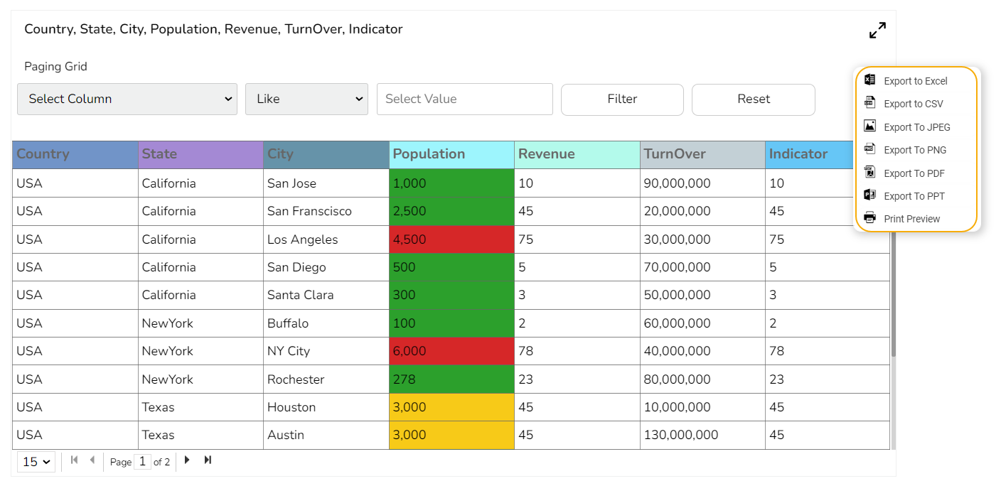 The Paging Data Grid is used to represent data in tabular form. Paging Data Grids can be used to filter data using columns, comparison operators, and search options provided.