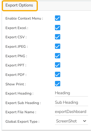 Global Export Type: Define the default export format using the drop-down (e.g., Screenshot, Tabular).