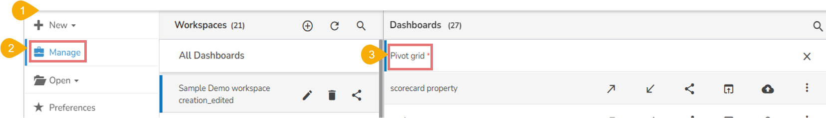 * Open an existing dashboard from the list of available dashboards (You can find the list of dashboards inside a Workspace).