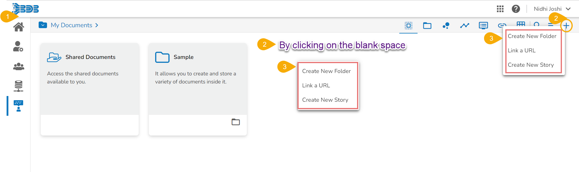A user can Create a Folder, Link a URL, and Create a Report under the My Documents or Public Documents space. All the folders and documents that a user create under the My Documents space of the Platform are provided with some attributive options.